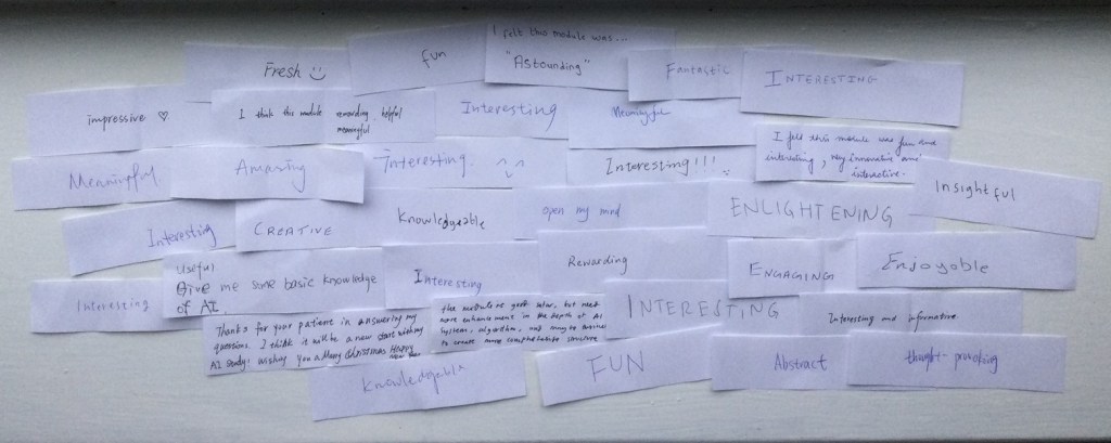 ‘amazing’, ‘astounding’, ‘fresh’, ‘impressive’, ‘meaningful’, ‘enlightening’, ‘open my mind’, ‘fun’, ‘novel’, ‘interesting’, ‘exciting’