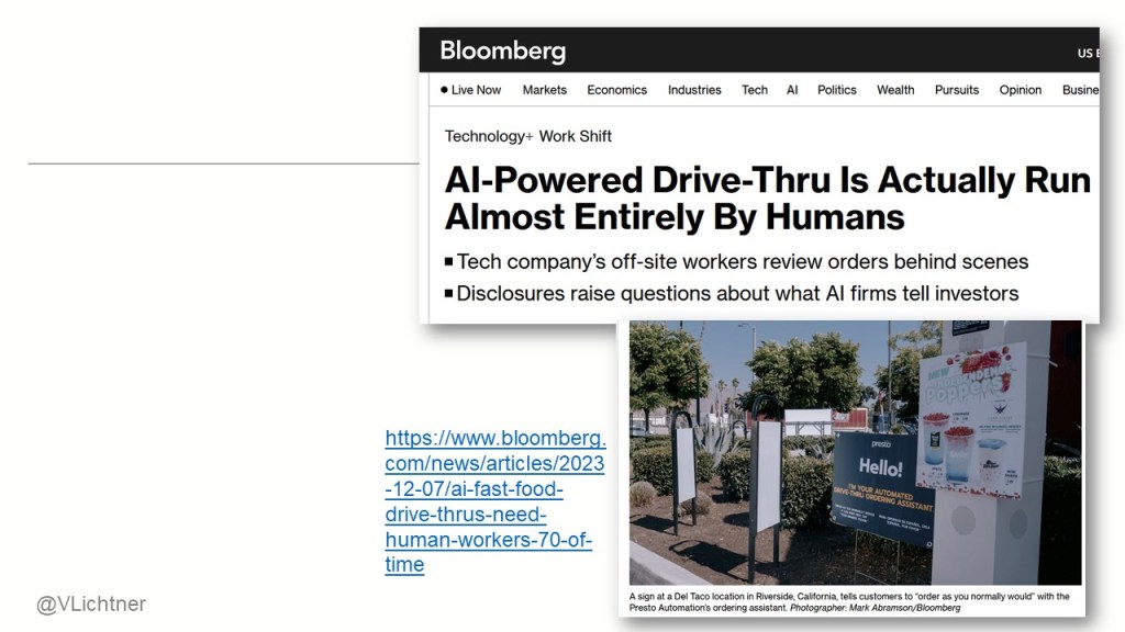 My thanks to the wonderful students taking my module on human-centred AI this past semester. Had fun uncovering the plentiful, resourceful, often unrecognised, human work behind AI – such as… apparently-autonomous cars, apparently-autonomous drive-in fast food systems, apparently-automated data moderation.
